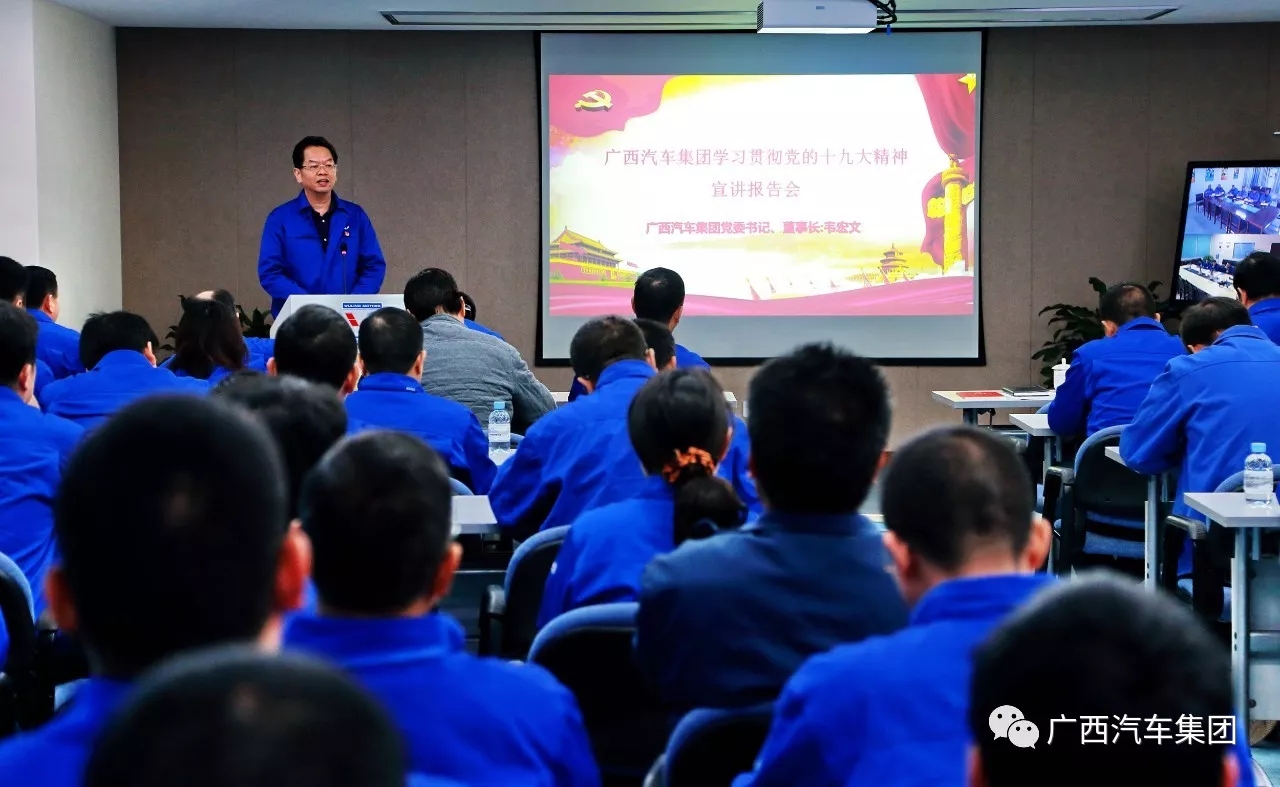 為深入學(xué)習(xí)貫徹黨的十九大精神,?12月6日,廣西汽車集團(tuán)舉行學(xué)習(xí)貫徹黨的十九大精神宣講報(bào)告會(huì),廣西汽車集團(tuán)黨委書(shū)記、董事長(zhǎng)韋宏文在會(huì)上作題為《新時(shí)代·新氣象·新作為》宣講報(bào)告。集團(tuán)公司黨委領(lǐng)導(dǎo)、各級(jí)黨組織書(shū)記、一級(jí)經(jīng)理、所屬企業(yè)負(fù)責(zé)人等一百多人現(xiàn)場(chǎng)聆聽(tīng)了報(bào)告,山東、重慶、桂客等單位以視頻形式參加報(bào)告會(huì)。